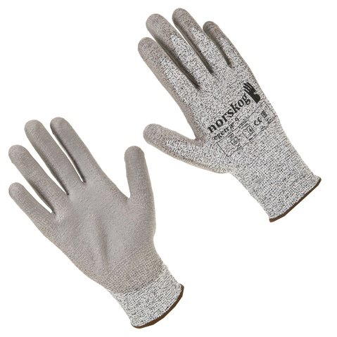 Schnittfester Handschuh, gestrickt mit einem Gewebe aus ultrahochfesten Polyethylenfasern (UHPPE), Glasfasern und weichen elastischen Spandexfasern. Mit Polyurethan beschichtet. Abgeschlossen mit einer Keder.